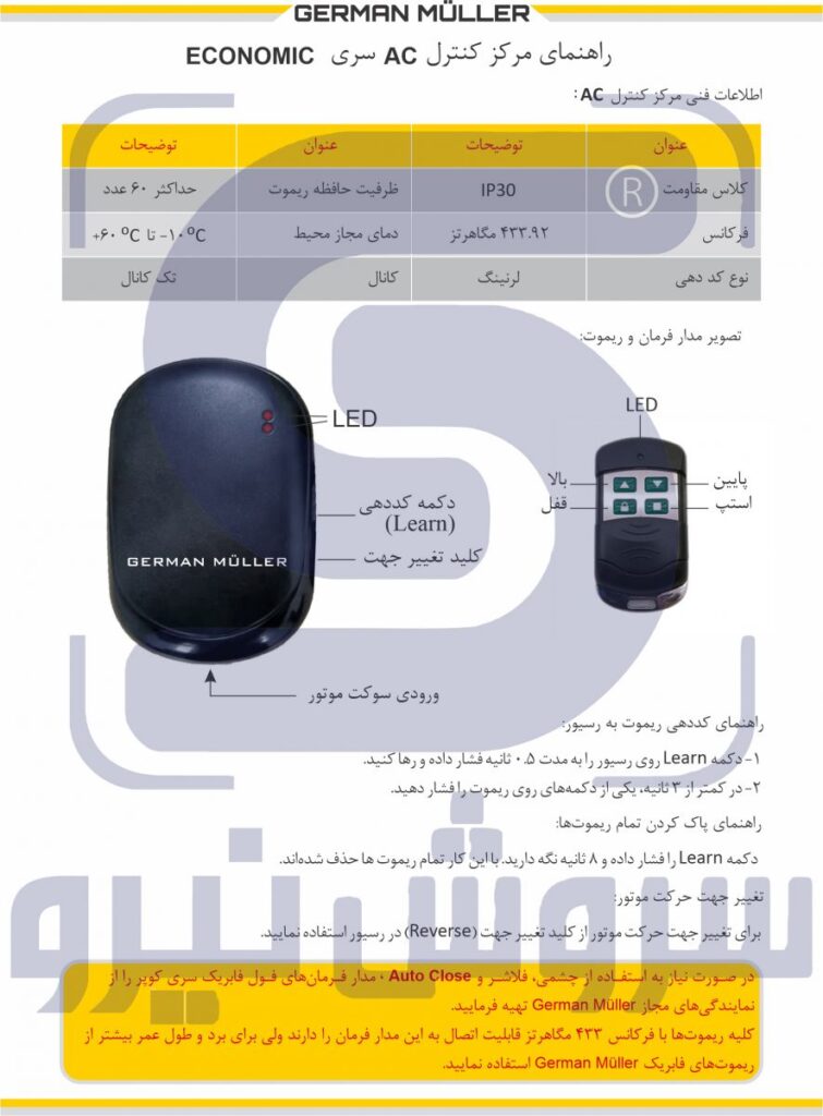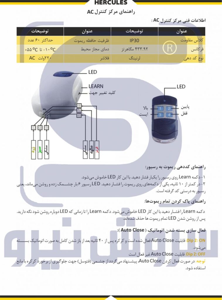 1. افزودن ریموت کنترل : دکمه Code را به صورت لحظه ای فشار دهید، چراغ روی مدار خاموش می شود ، با فشردن دکمه استوپ ریموت کنترل ، ریموت به حافظه مدار اضافه می شود.