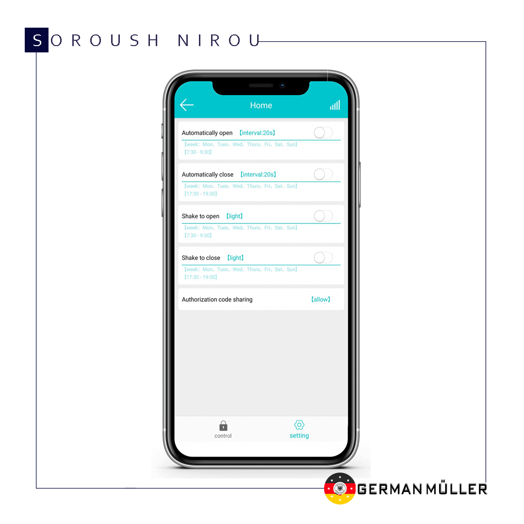 Shake to open: با روشن کردن این گزینه، زمانیکه به نرم افزار وارد میشوید، بدون نیاز به رفتن در قسمت ریموت کنترل و انتخاب دکمه بالا، با تکان دادن تلفن ، درب باز میشود.