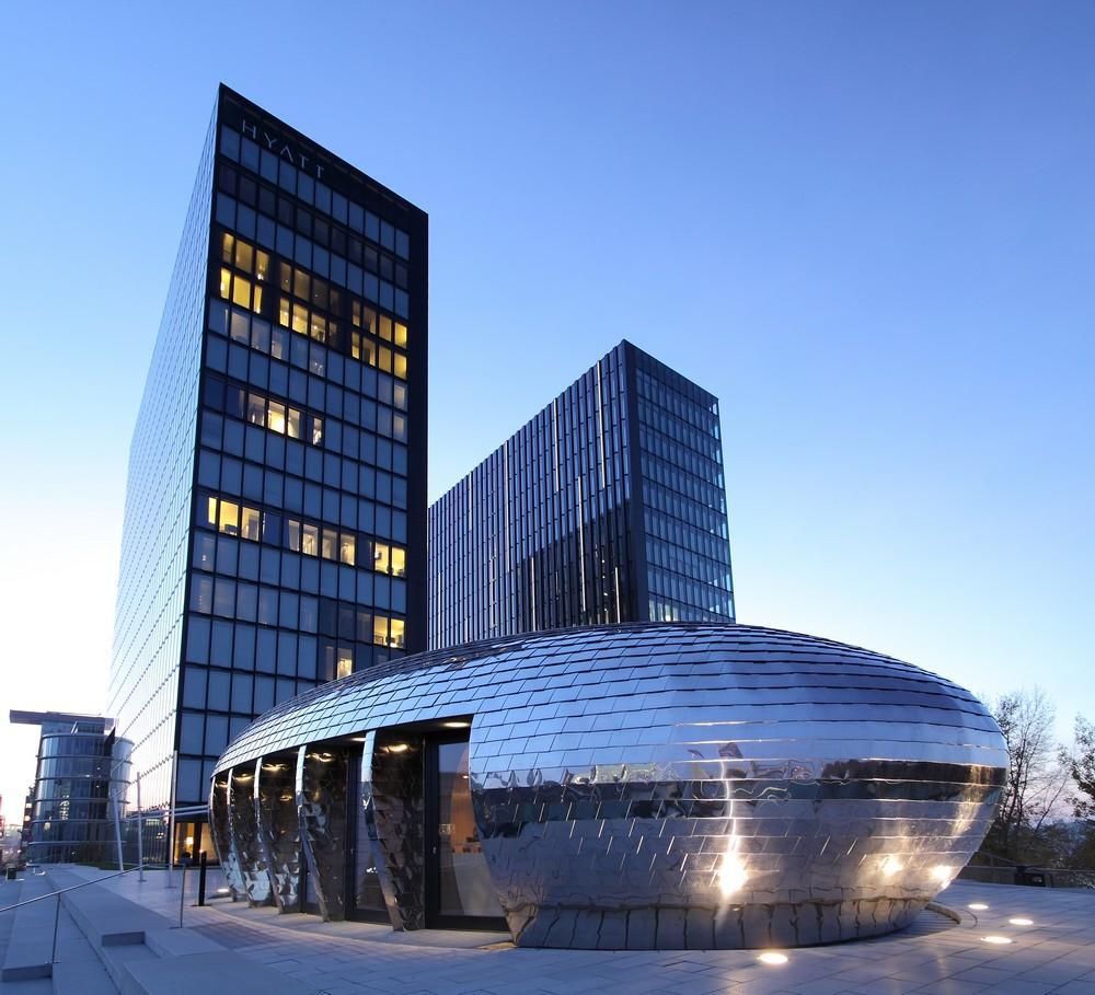 • مجموعه Hafenspitze, Hyatt-Hotel از دو ساختمان با طراحی بسیار خاص و الهام گرفته شده از شهر صنعتی دوسلدورف تشکیل شده است. ساختمانی که رو به شمال شرقی است در 17 طبقه با کاربری اداری است و ساختمان دوم که رو به جنوب شرقی است هتل لوکسی با ظرفیت 300 اتاق است. در درب ورودی هر دو برج از درب‌های اتوماتیک گردان کمپانی GU مدل پیشرفته GRA استفاده شده است که درب ورودی ساختمان اداری با ارتفاع 7.86 متر یکی از بلندترین درب‌های موجود در اروپاست. برای نمایش پروژه در نقشه سه بعدی گوگل اینجا کلیک کنید.